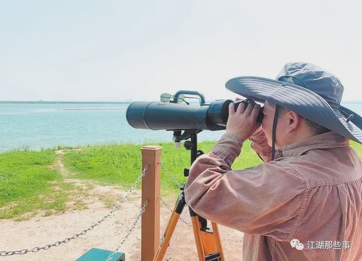 4月15日,长江君山段林阁老监测站台上,周辉军对着江面,用连续三声悠长的口哨声,试着召唤长江里可爱的精灵——江豚。