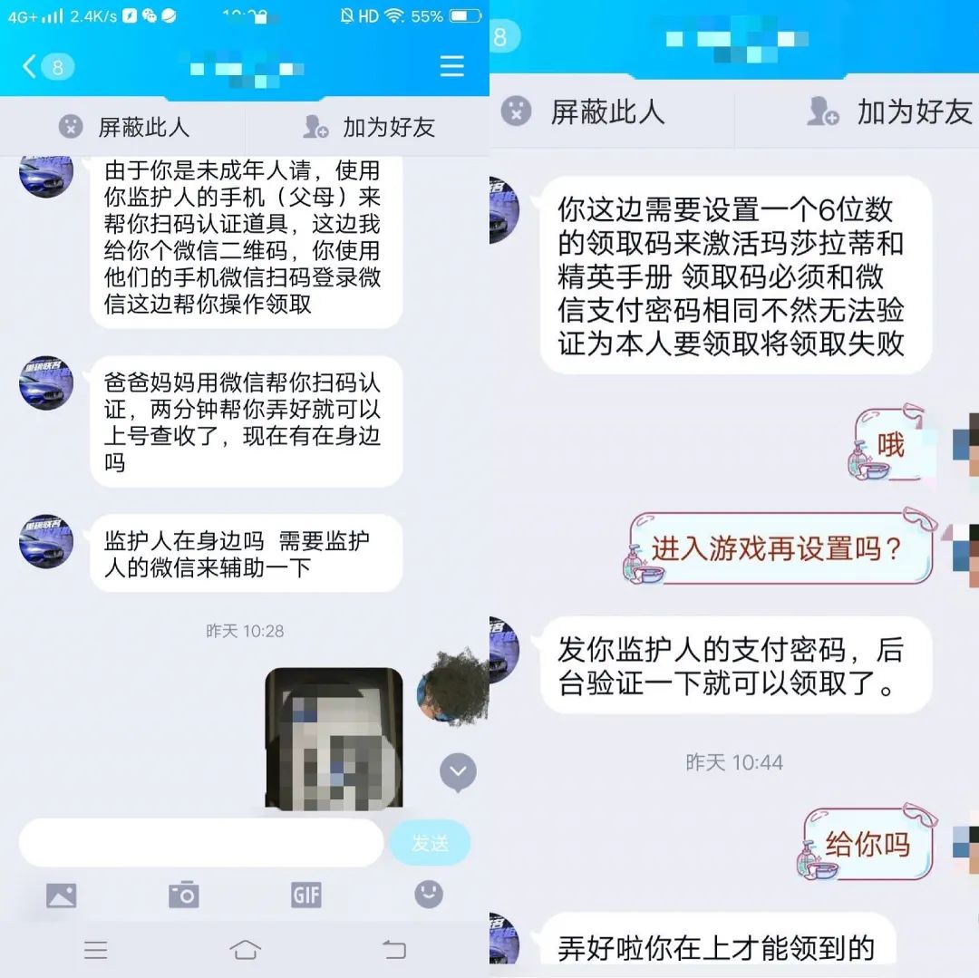 小钟的 QQ 聊天记录显示,在确定小钟希望领取福利后,群主称因为小钟是未成年人,领取福利需要用父母的手机微信才能扫码认证,并告诉小钟,当天的名额只剩3个了,马上认证的话只要2分钟就可以成功领取。不觉有疑的小钟马上拿来了妈妈的手机,并按照群主的提示将他发过来的二维码扫了一遍又一遍,期间,在群主的诱导下,还将手机调成了飞行模式,并将妈妈微信支付的密码告诉了群主。