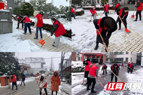 在活动现场,青年志愿者们身穿红色马甲,拿着铁锨、竹扫把等工具,积极投入到清除积雪的工作中。雪虽然还在下,但青年志愿者们不畏严寒,通过他们的努力,一条条出行要道的积雪逐渐被清除干净。