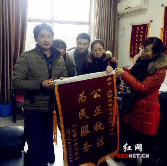 红网时刻岳阳1月26日讯(通讯员 刘勇)1月26日上午,在湖南省岳阳市岳阳楼区劳动保障监察大队,李某芳等15名劳动者欢欢喜喜领到了欠薪,现场赠送了“公正执法 热情服务”的锦旗,并一再激动地握着执法人员的手,说:“这么快就让我们拿到了过年钱,监察大队真是我们的贴心人!”
