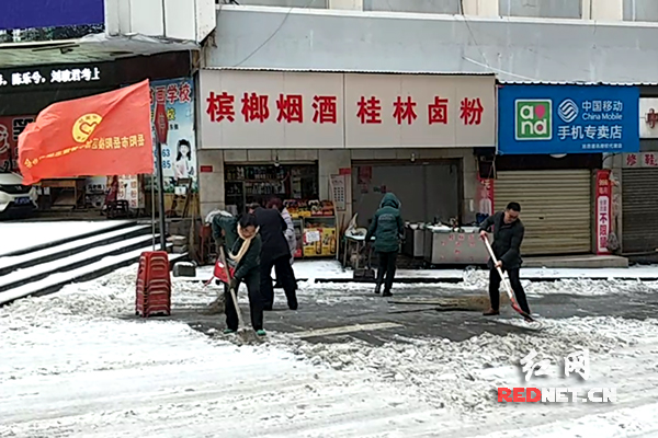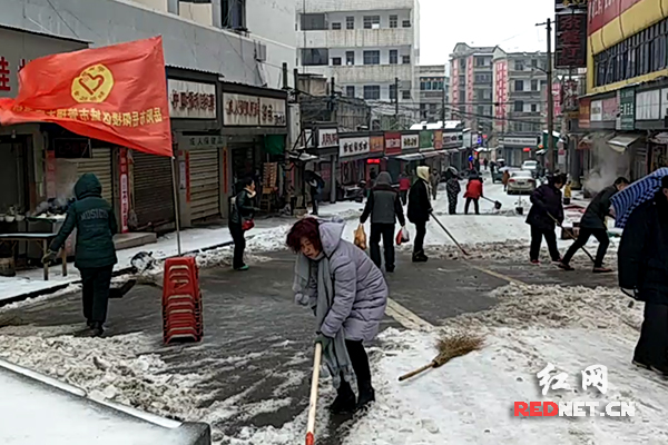 26日至27日,岳阳市岳阳楼区城管志愿者协会的志愿者冒着严寒铲雪除冰。