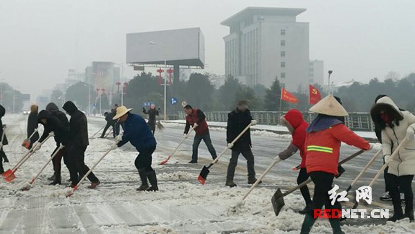 岳阳市云溪区党员干部、志愿者在开展除雪行动。