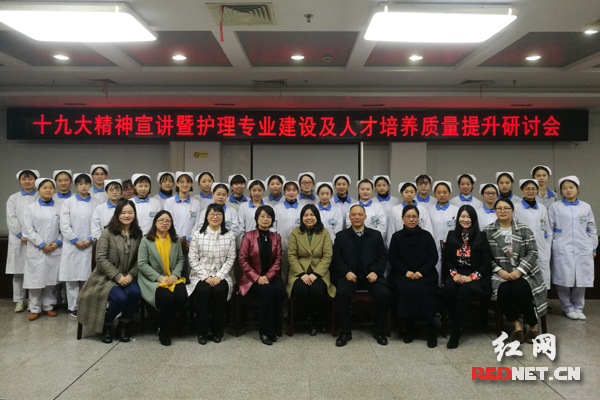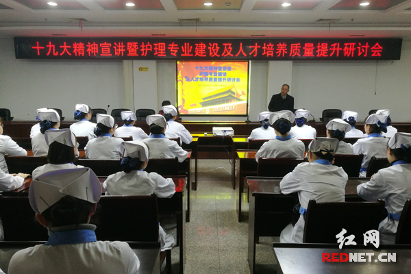 红网时刻岳阳2月28日(记者 冯刚)昨天上午,岳阳职业技术学院在岳阳市二人民医院召开“十九大精神宣讲暨护理专业建设及人才培养质量提升研讨会”,为在该院临床实习基地学习的护生们进行了一次生动丰富的思政教育。湖南省党代表、岳阳职业技术学院党委委员、护理学院院长尚云峰及护理学院总支书记胡先鸿等与会。