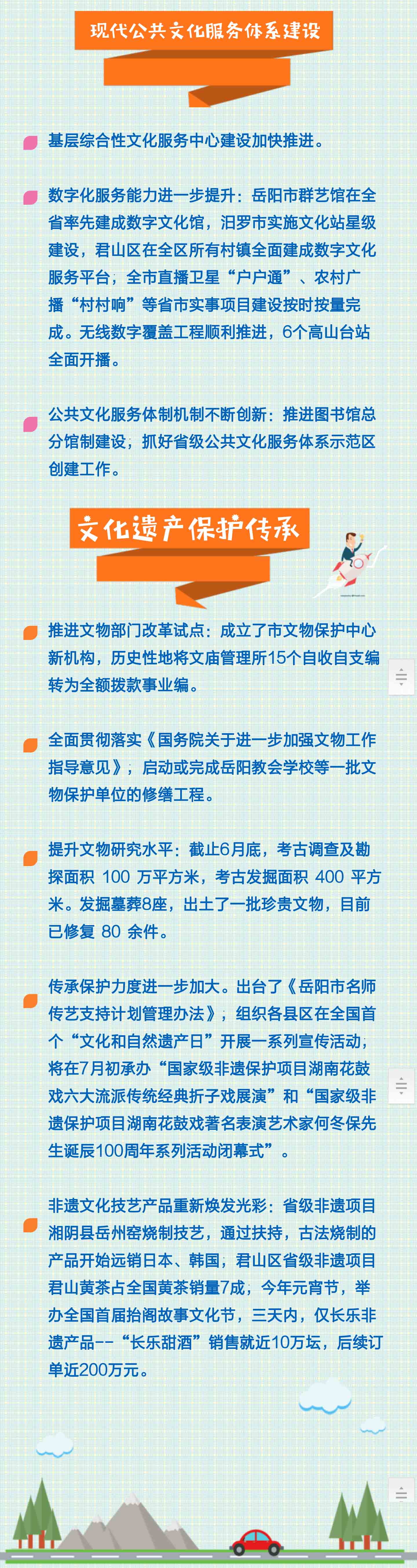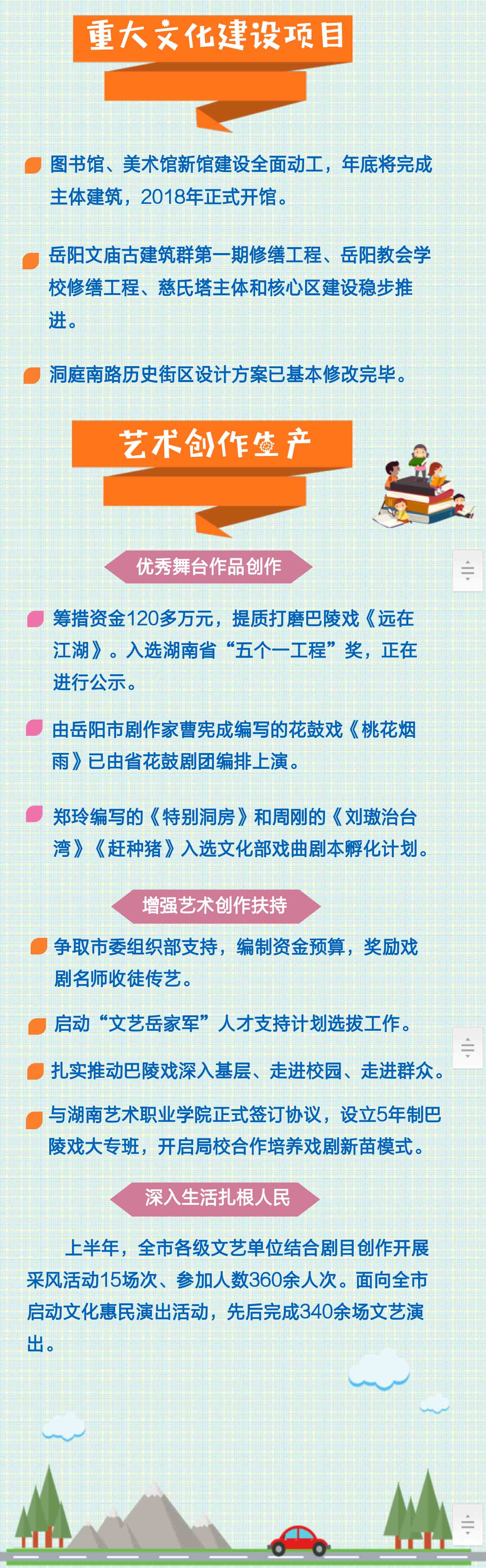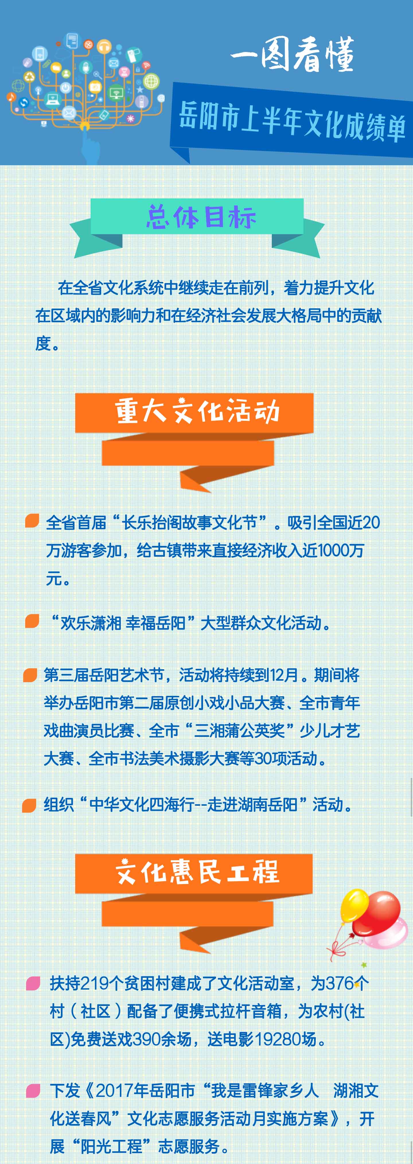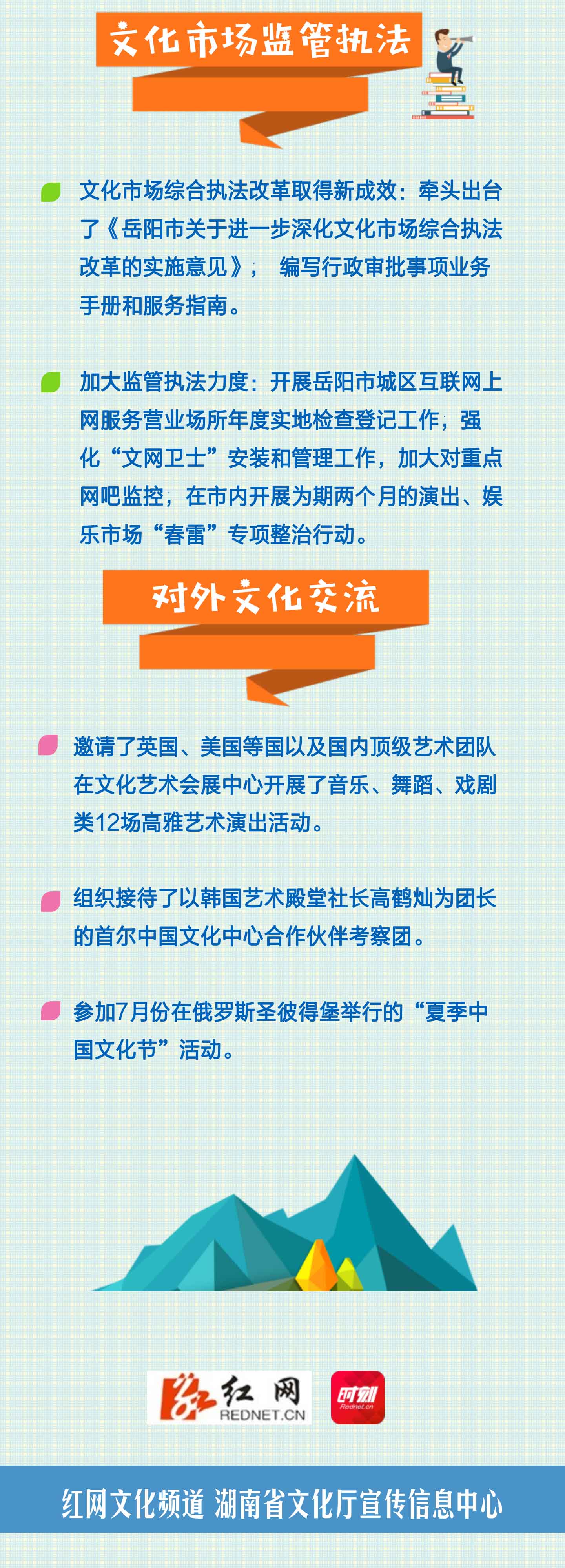 编者按:党的十八大以来,以习近平同志为核心的党中央高度重视文化建设,对文化改革发展做出了系列具有深远影响的重大战略部署。湖南省第十一次党代会提出了建设文化强省的目标。迈步在文化强省的征程中,全省文化系统围绕中心、服务大局、勇于创新、主动作为,各项工作取得了明显成效。为集中展示全省上半年的文化成绩,以优异成绩迎接党的十九大召开,即日起,红网·时刻新闻、文化湖南将以图解的形式陆续推出“2017年上半年文化成绩单”系列报道,以飨读者。