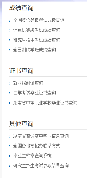 比如“网上查询”,可以通过这个部分进行全国英语等级考试成绩查询、计算机等级考试成绩查询、就业报到证查询、湖南省普通高中毕业信息查询等等。