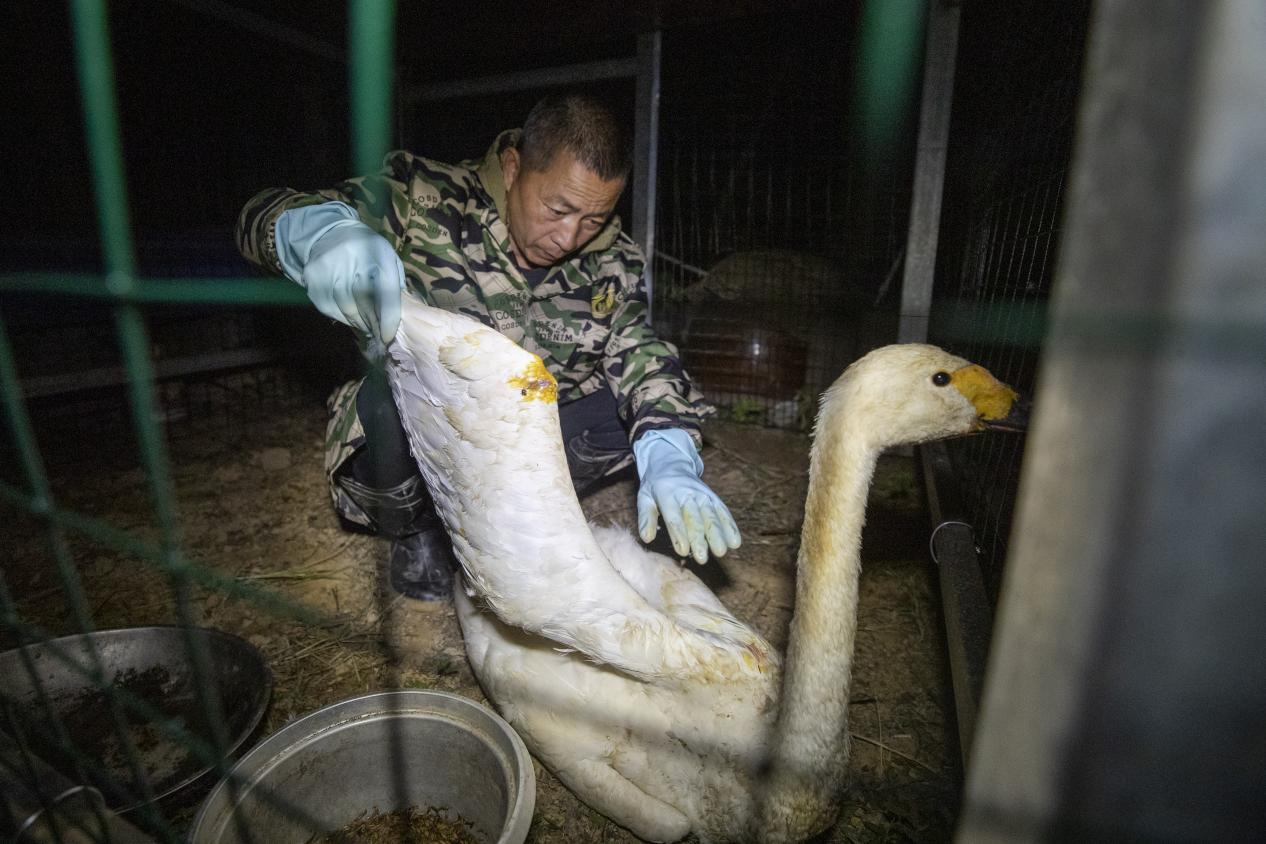 志愿者救助受伤天鹅。周洋/摄